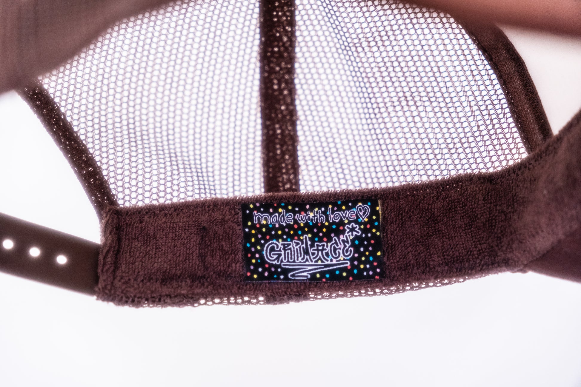 tan & brown snapback foam trucker with embroidered GRiMACE bear patch front and center and woven internal label on integrated sweatband